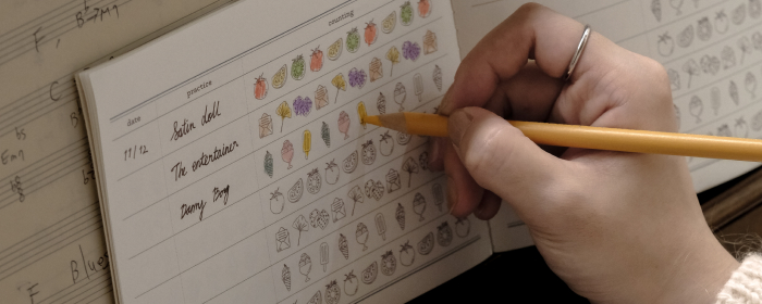 ONE by ONE PRACTICE LOG | 어릴 적 피아노 학원에서 사용하던 연습 카드를 기억하시나요? 칸을 채우던 손맛, 몰래 사과를 두 개 칠하던 순간의 추억을 담아보았습니다. 악기, 운동, 언어 공부... 어떤 것이든 성실하게 채워가는 시간을 기록해 보세요. 이제는 사과를 한 번에 하나만 칠하기로 약속하면서요. |